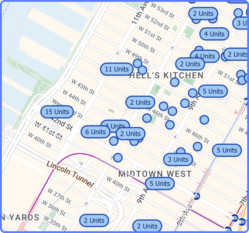 Typically, when searching on a map, a single item occupies a distinct location on the X and Y axes. However, because multiple listings can exist within the same building, we needed a solution that would allow users to easily access all the listings in a given area when searching on our map.